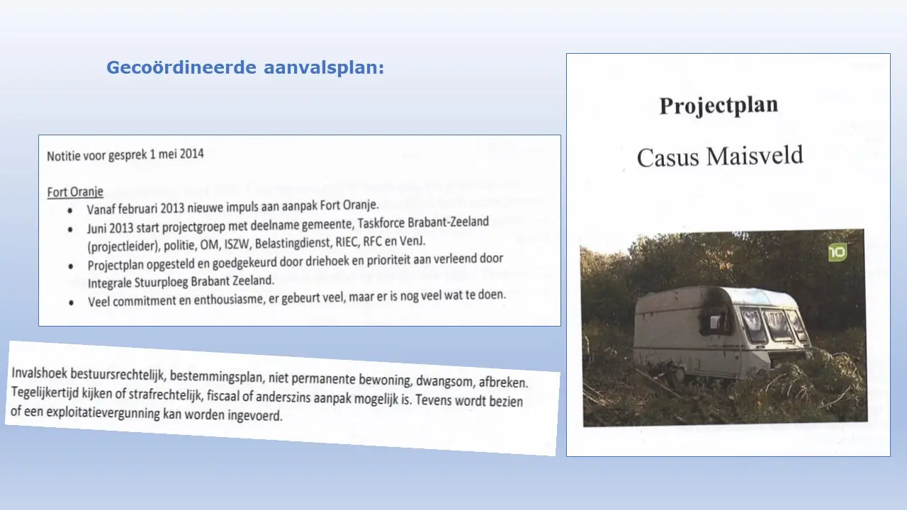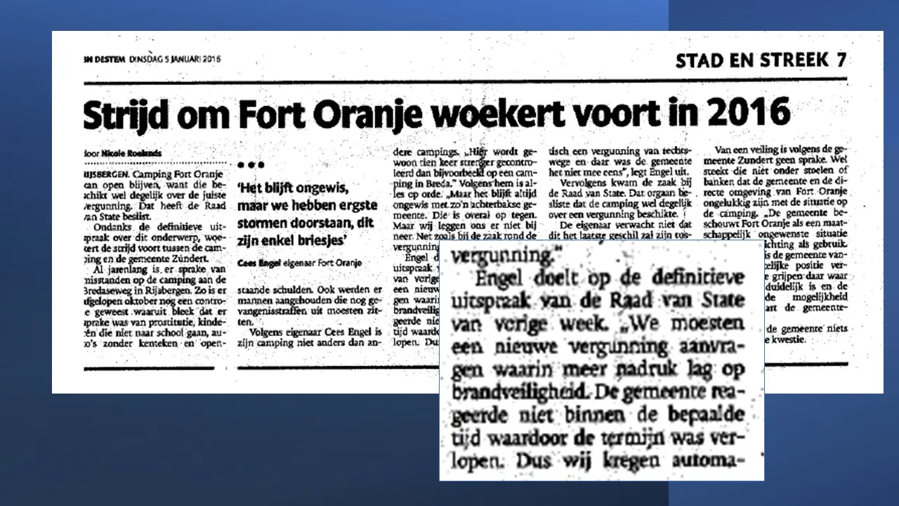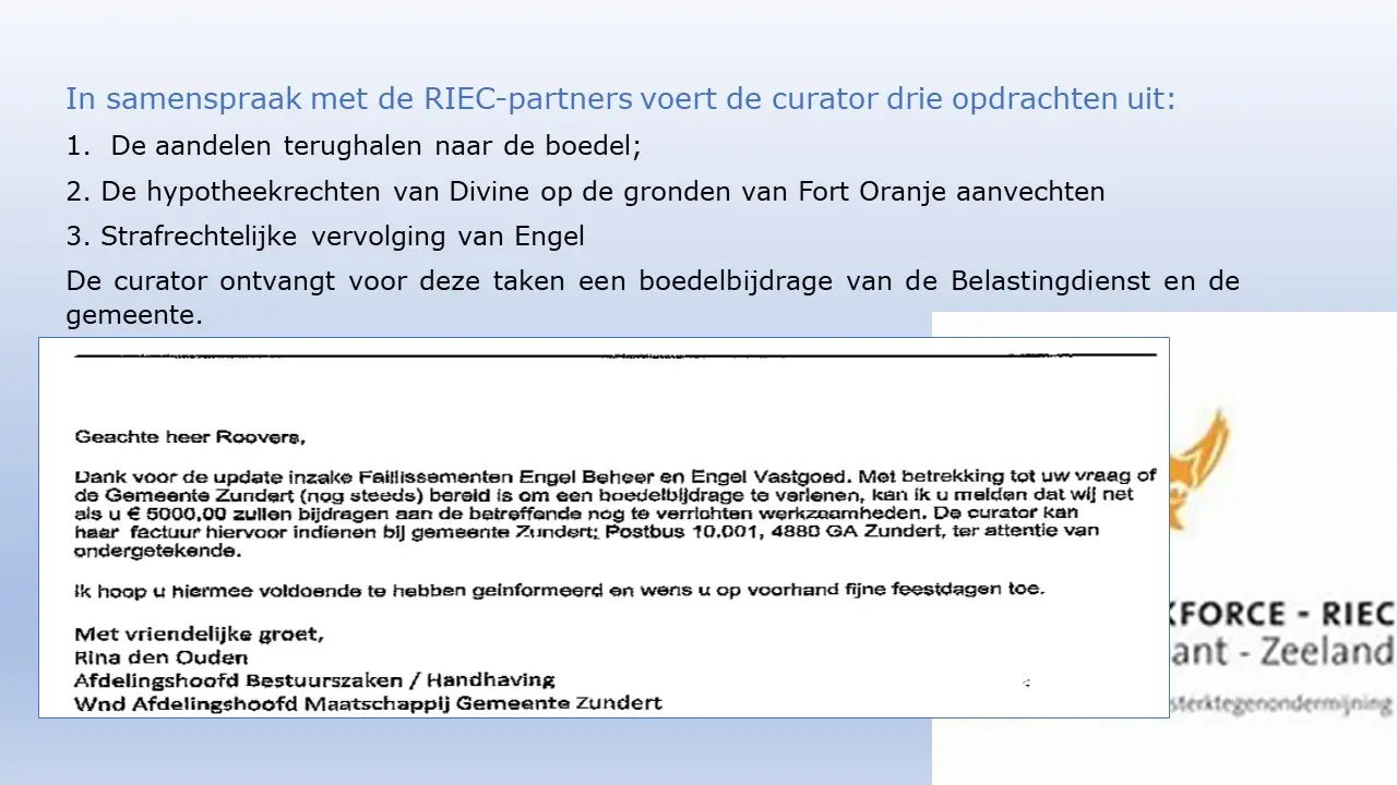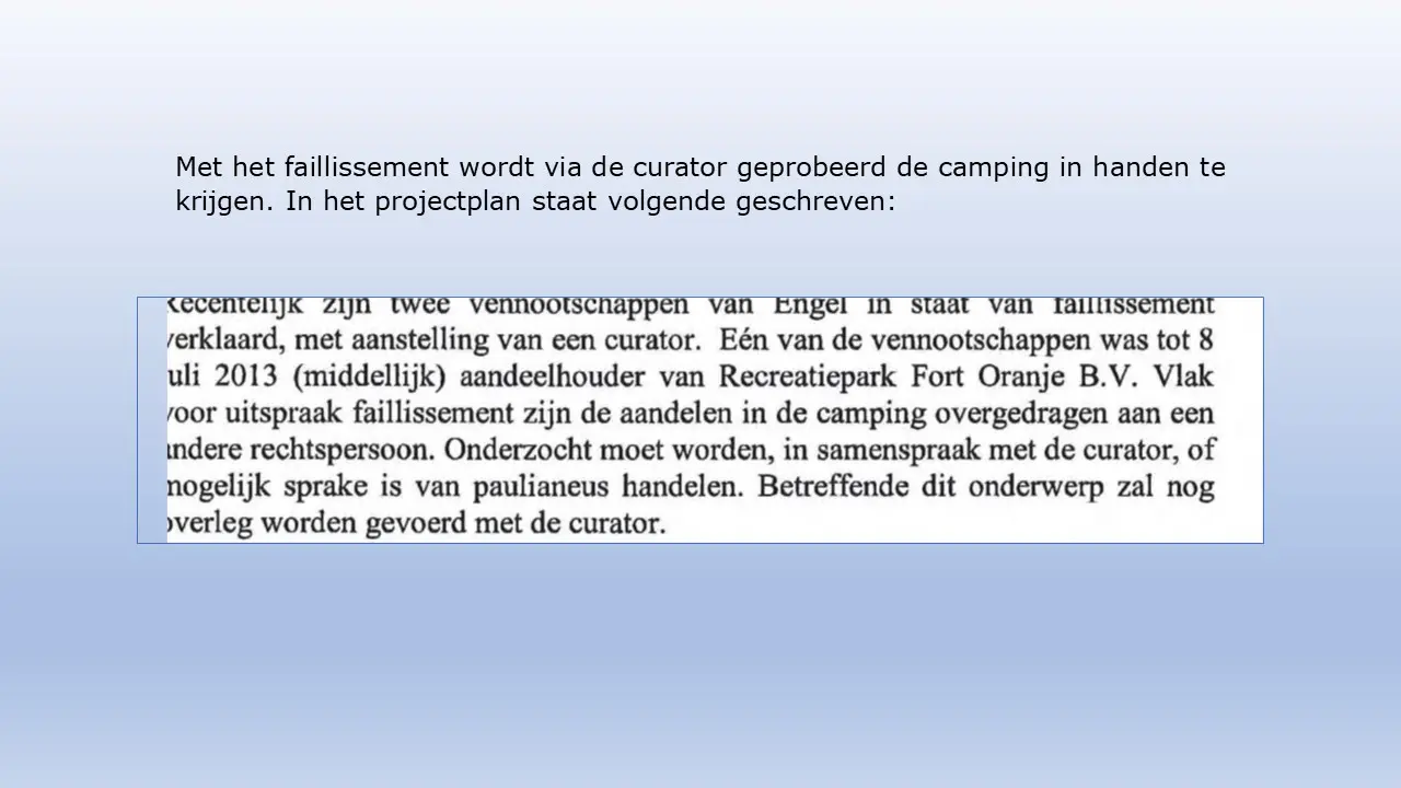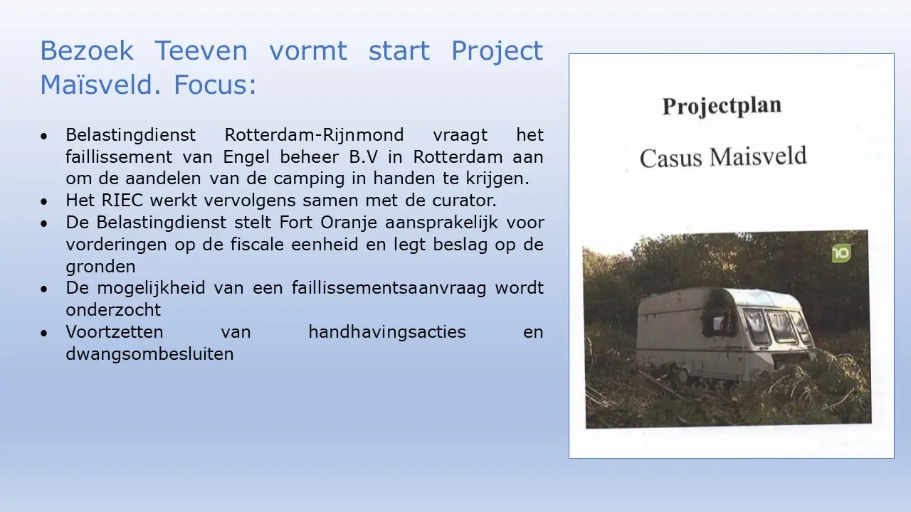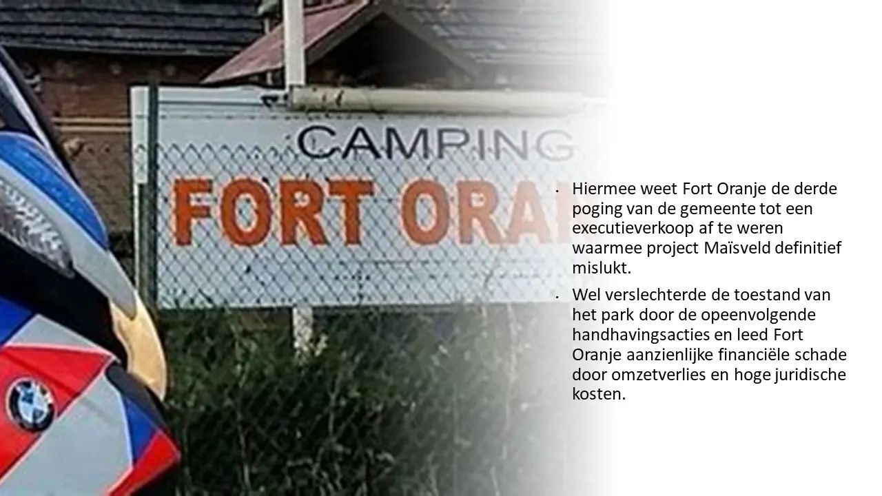 Zij bespreken dit aan de hand van allerlei verstoringsacties van het RIEC, die door het inzetten van de Belastingdienst tot curatoren tot privébedrijven alles proberen om camping Fort Oranje te onteigenen.