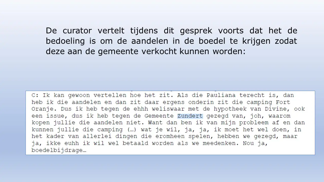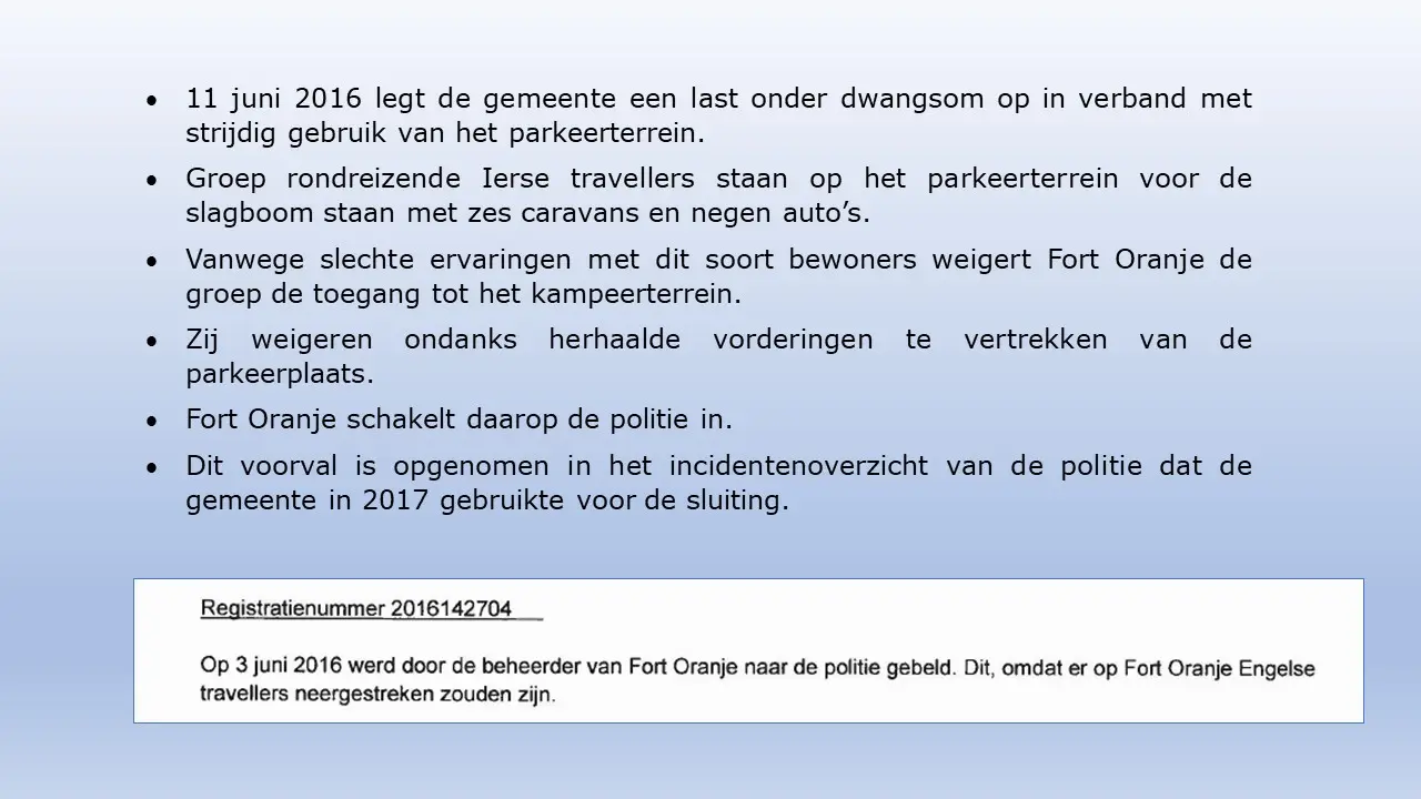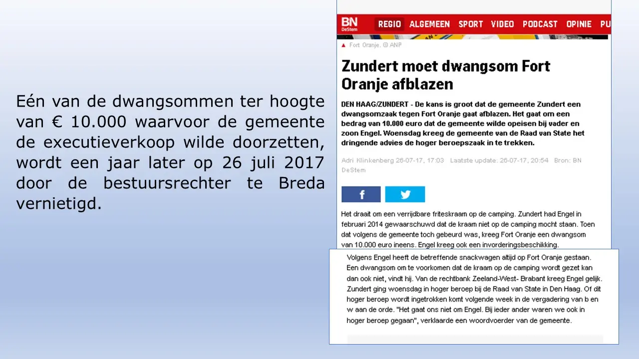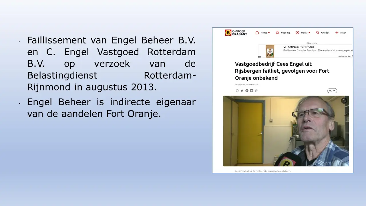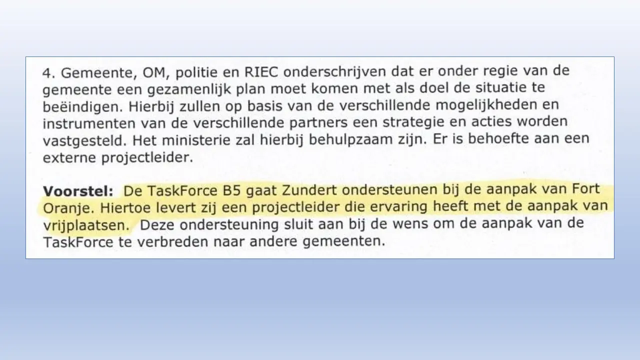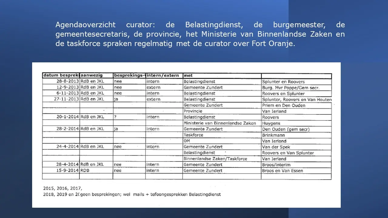 Zij bespreken dit aan de hand van allerlei verstoringsacties van het RIEC, die door het inzetten van de Belastingdienst tot curatoren tot privébedrijven alles proberen om camping Fort Oranje te onteigenen.