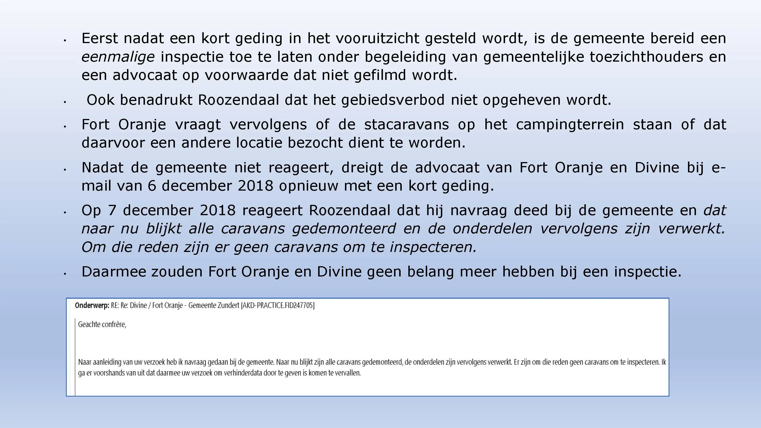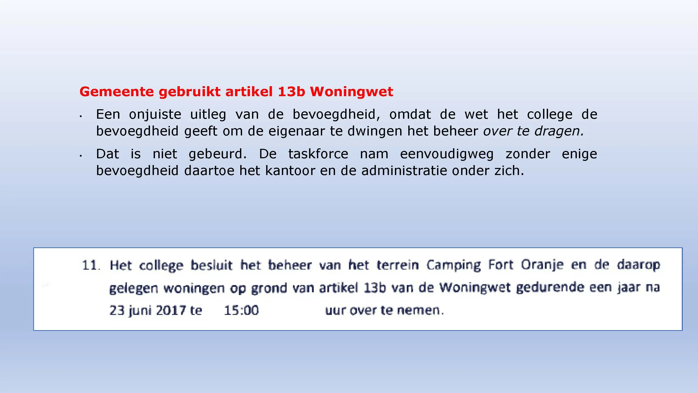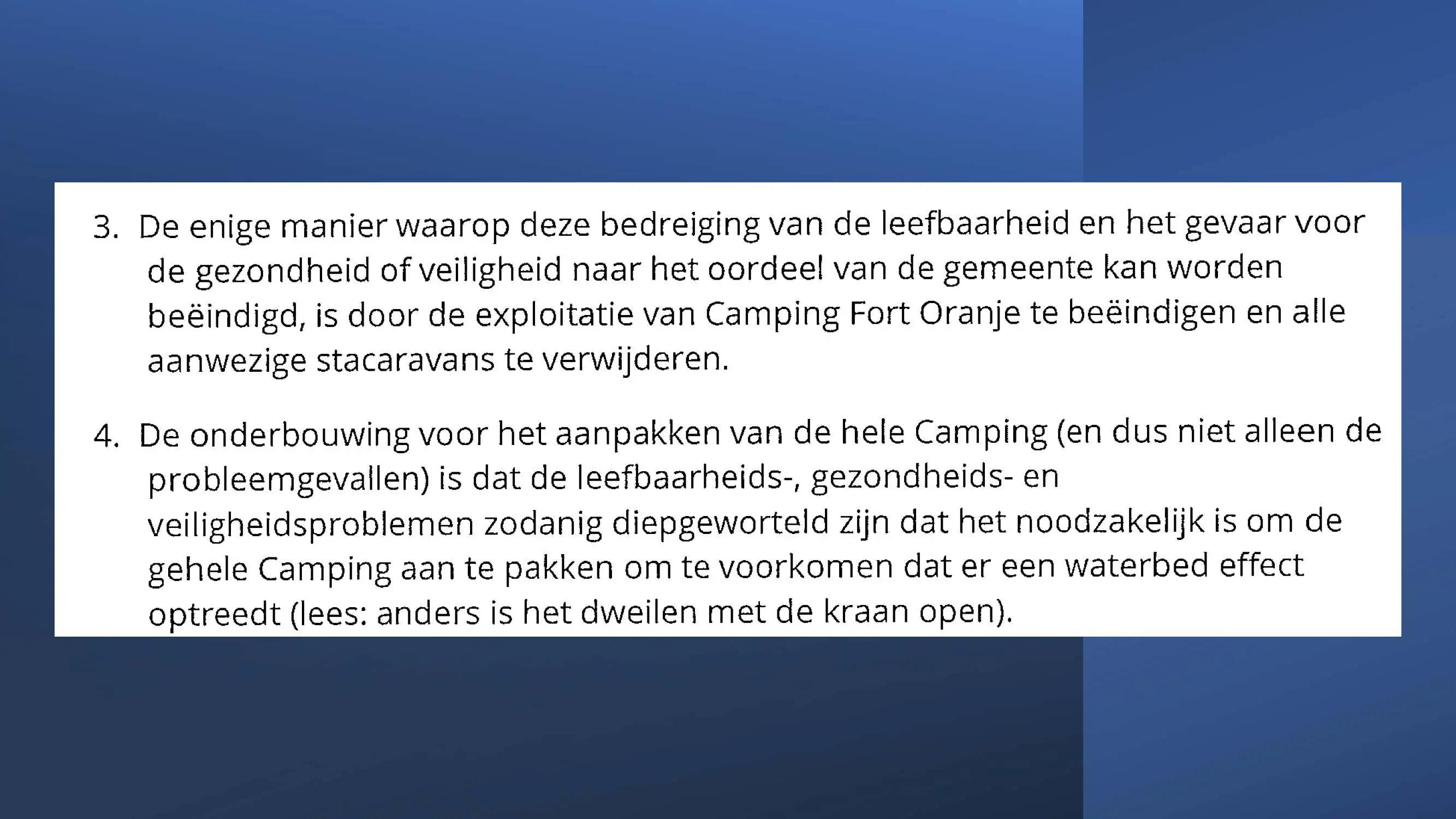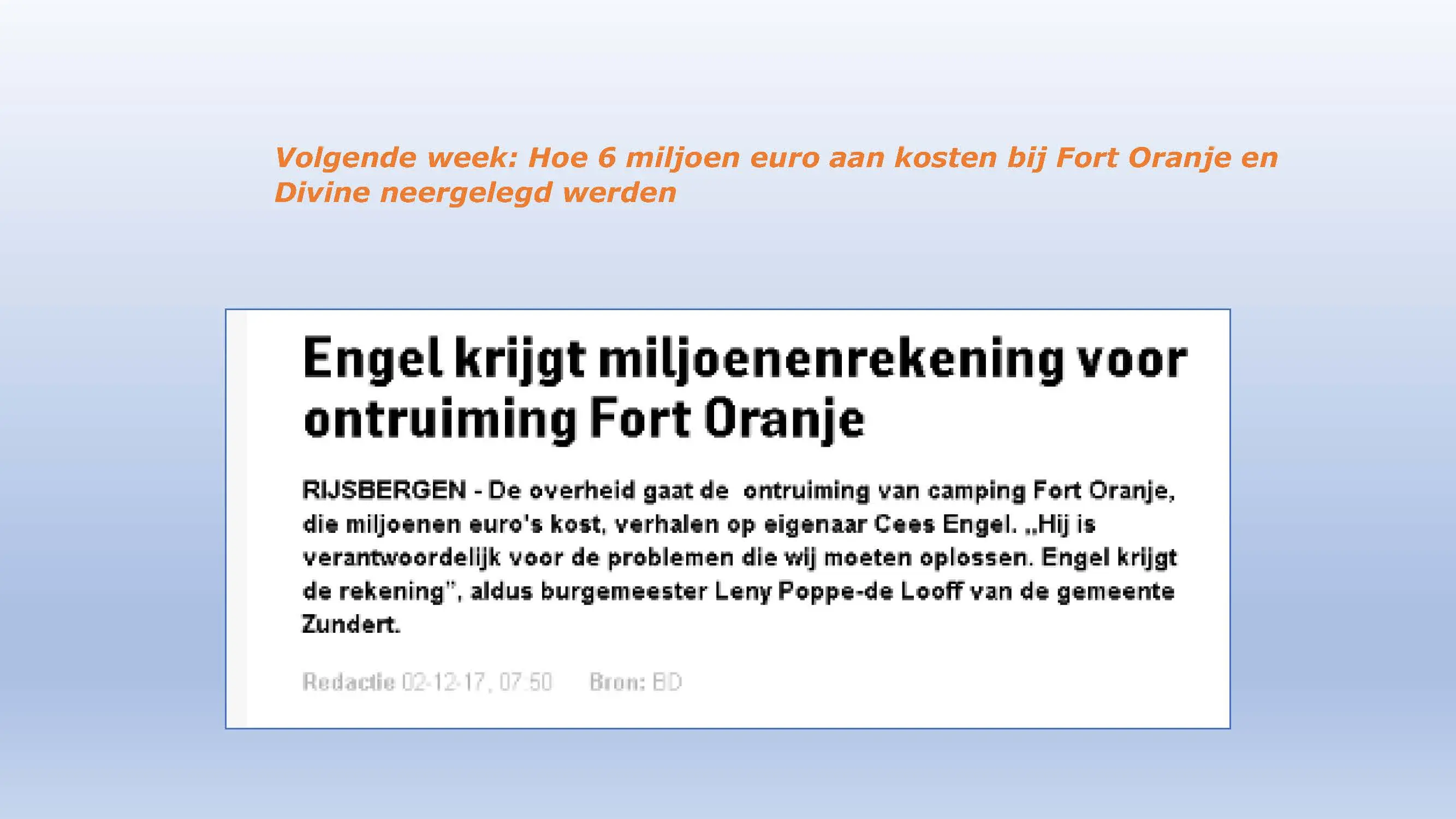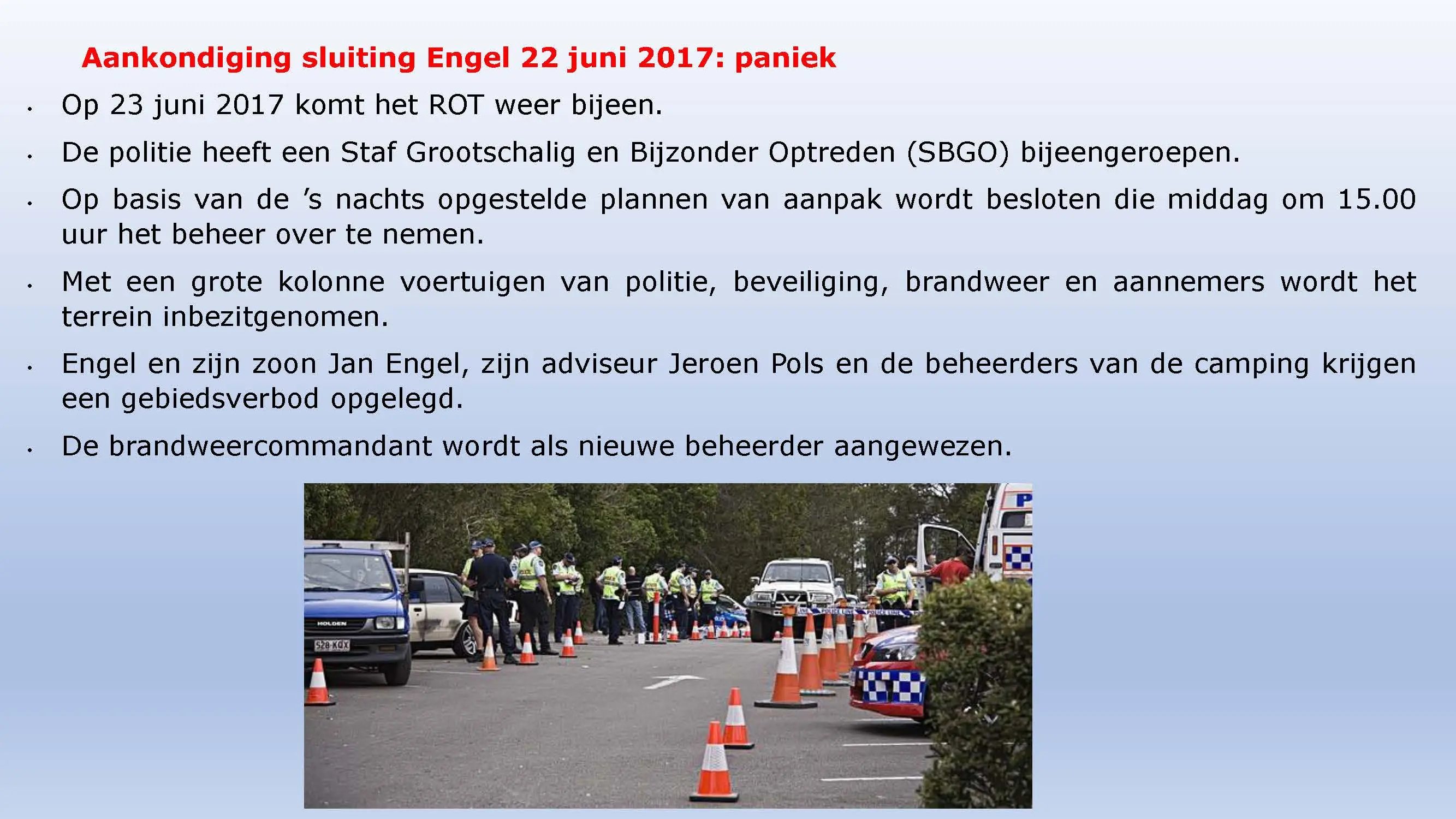 Wat hebben ze daarna gedaan? Vooral bedrog gepleegd, valsheid in geschrifte, rechters voorgelogen. Zelfs de media zich ging afvragen of het optreden van het bestuur nog wel rechtmatig was. Ondanks dat er al vaststond dat er geen bevoegdheden waren, is de camping in beslag genomen, is de eigenaar gearresteerd door middel van een gebiedsverbod, en zijn alle caravans afgevoerd en gesloopt geheel tegen het plan van aanpak in. Volgende week nemen Jeroen en Willem de rekeningen door, namelijk alle beslagen en alle kosten die werden neergelegd bij de eigenaar om het plan te bewerkstelligen dat ie de camping niet meer van de hand kon doen.