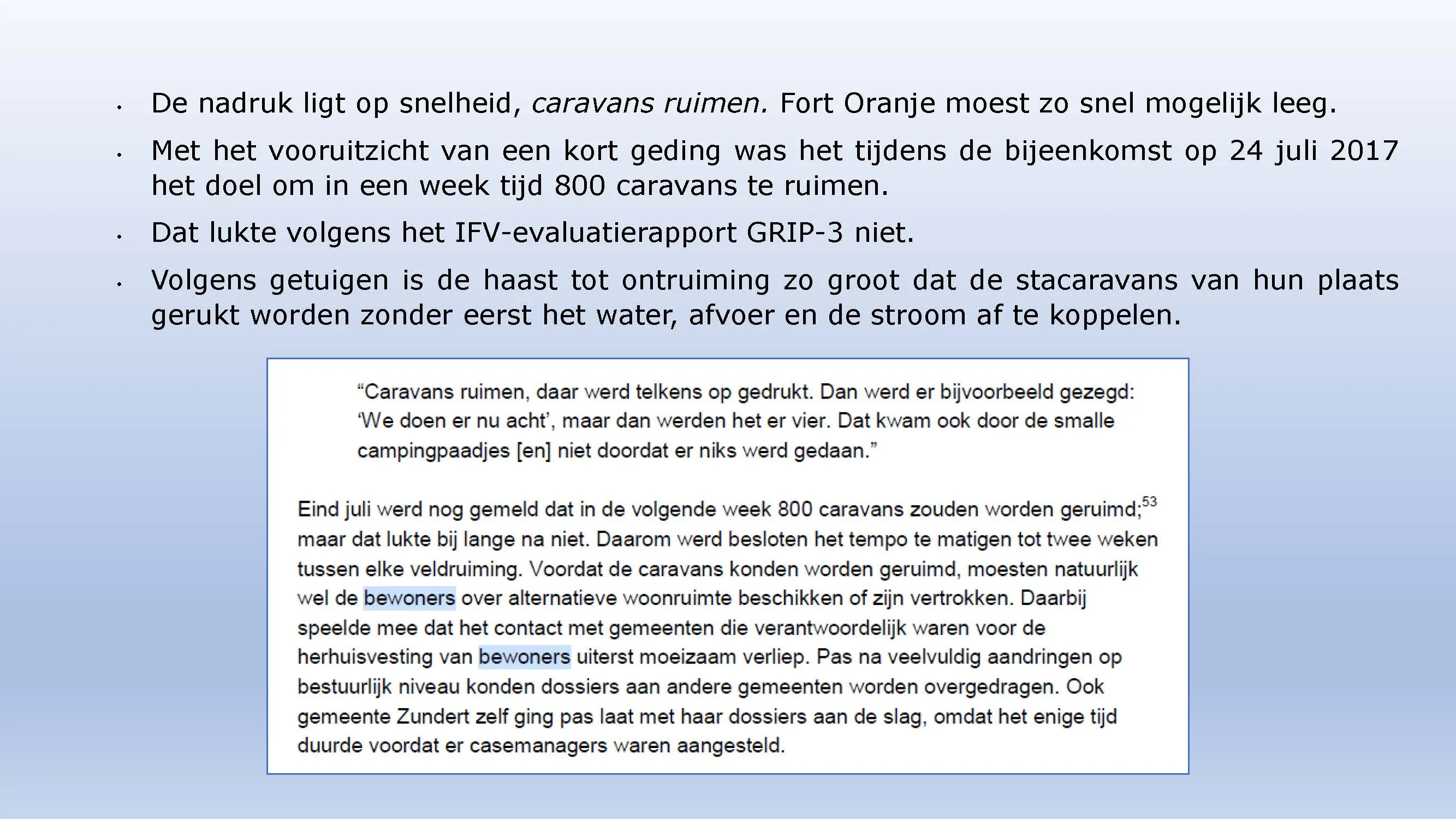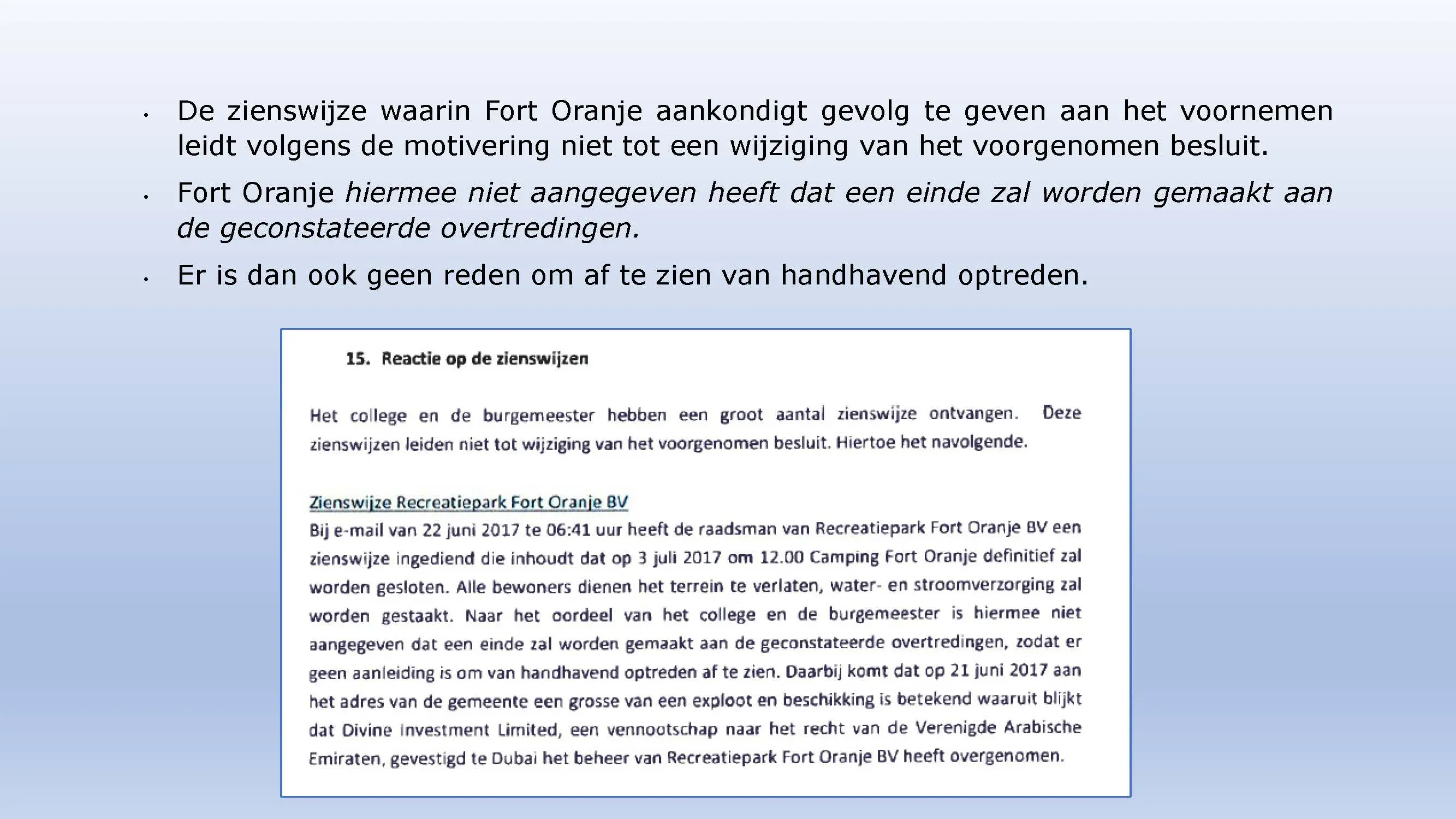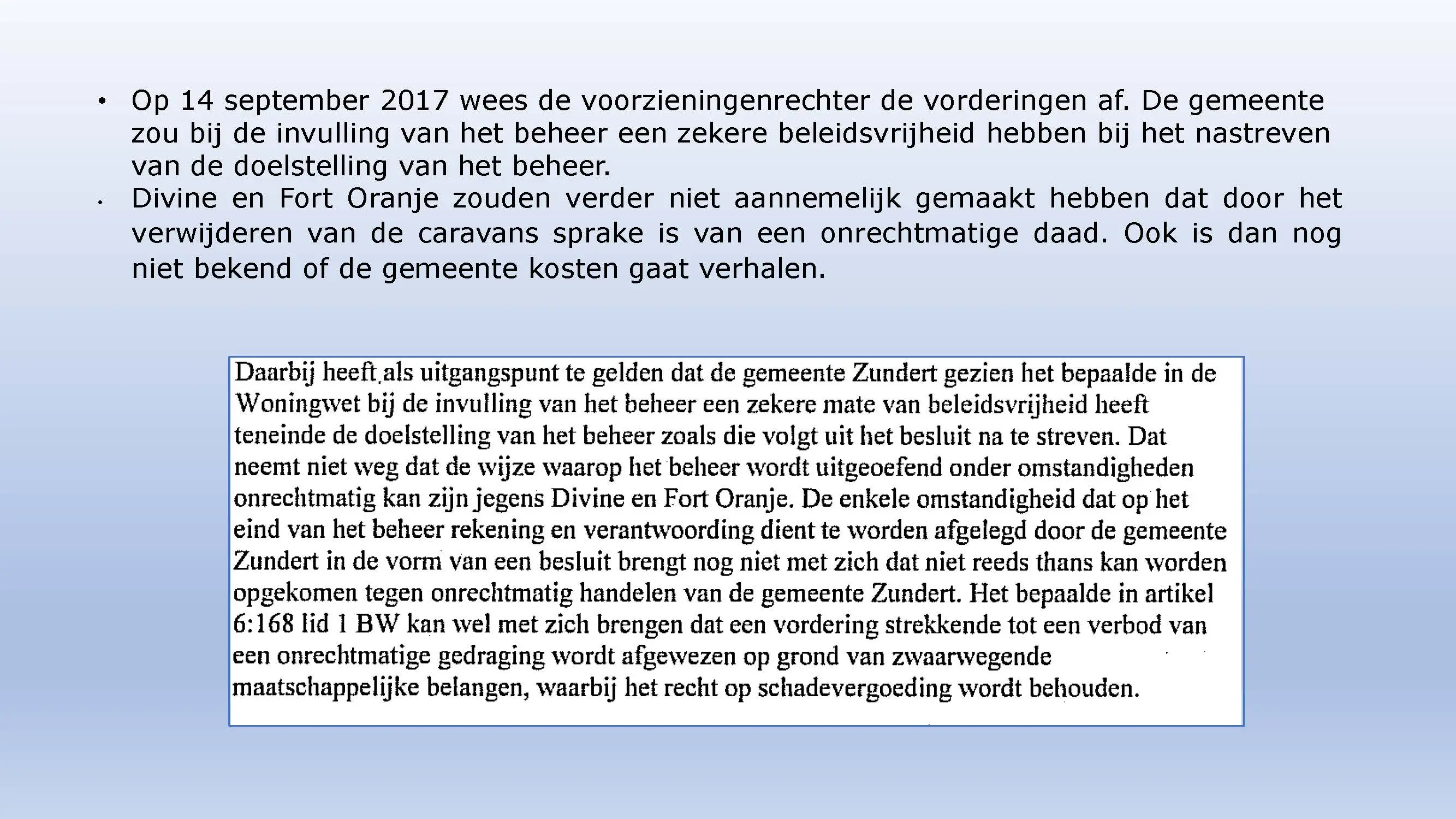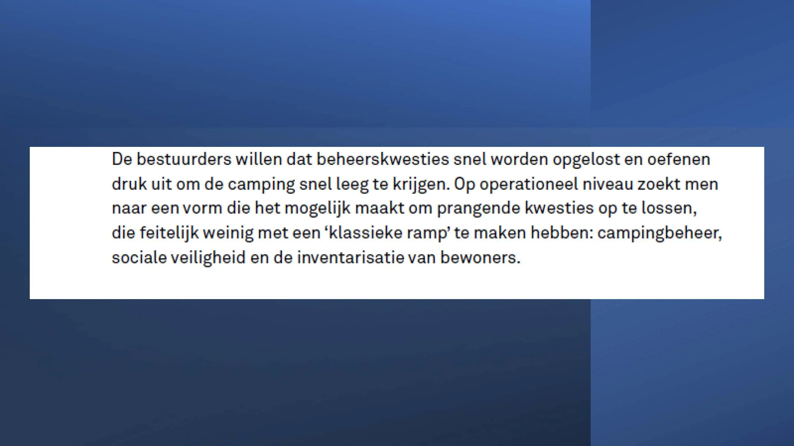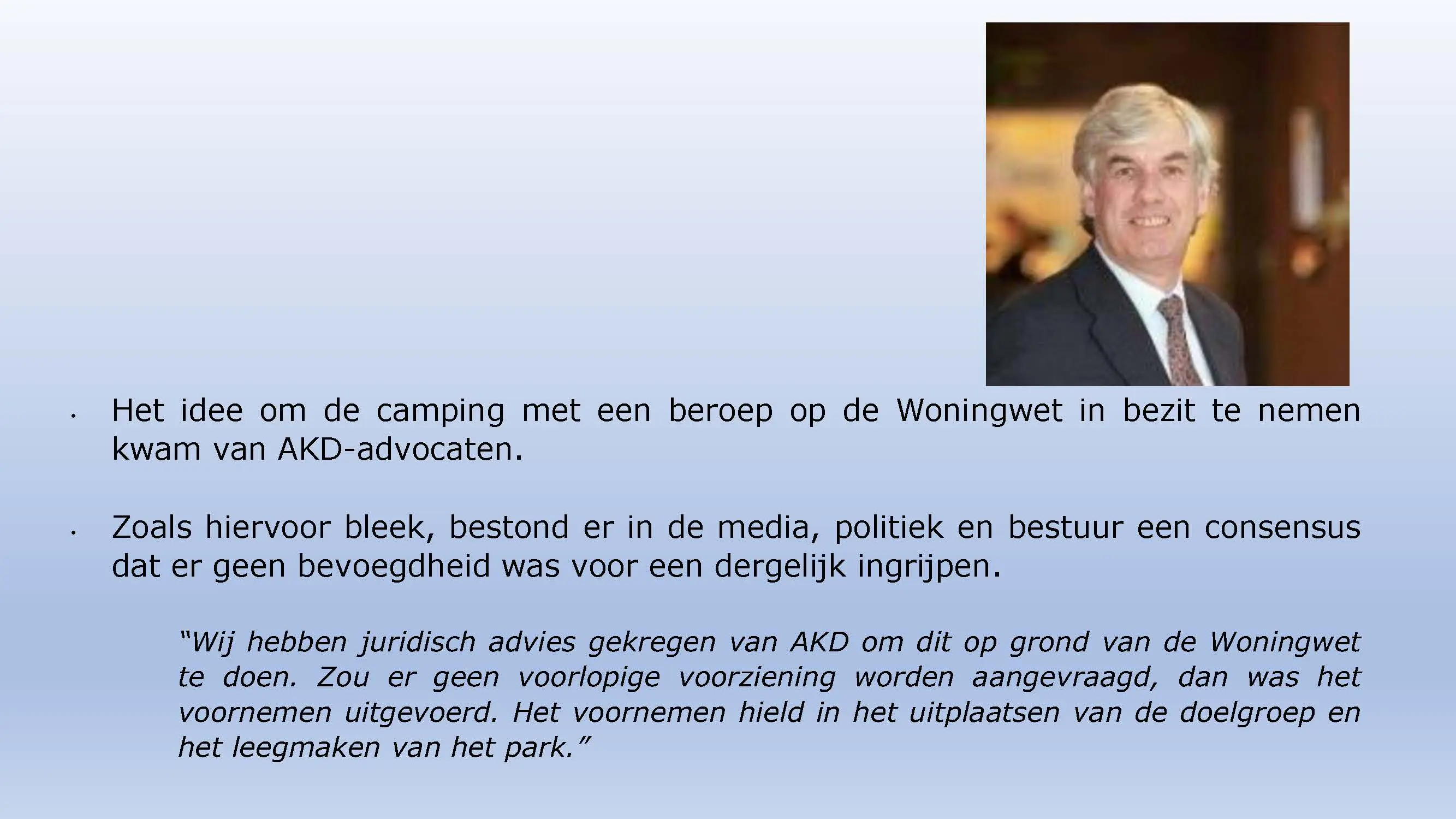 Wat hebben ze daarna gedaan? Vooral bedrog gepleegd, valsheid in geschrifte, rechters voorgelogen. Zelfs de media zich ging afvragen of het optreden van het bestuur nog wel rechtmatig was. Ondanks dat er al vaststond dat er geen bevoegdheden waren, is de camping in beslag genomen, is de eigenaar gearresteerd door middel van een gebiedsverbod, en zijn alle caravans afgevoerd en gesloopt geheel tegen het plan van aanpak in. Volgende week nemen Jeroen en Willem de rekeningen door, namelijk alle beslagen en alle kosten die werden neergelegd bij de eigenaar om het plan te bewerkstelligen dat ie de camping niet meer van de hand kon doen.