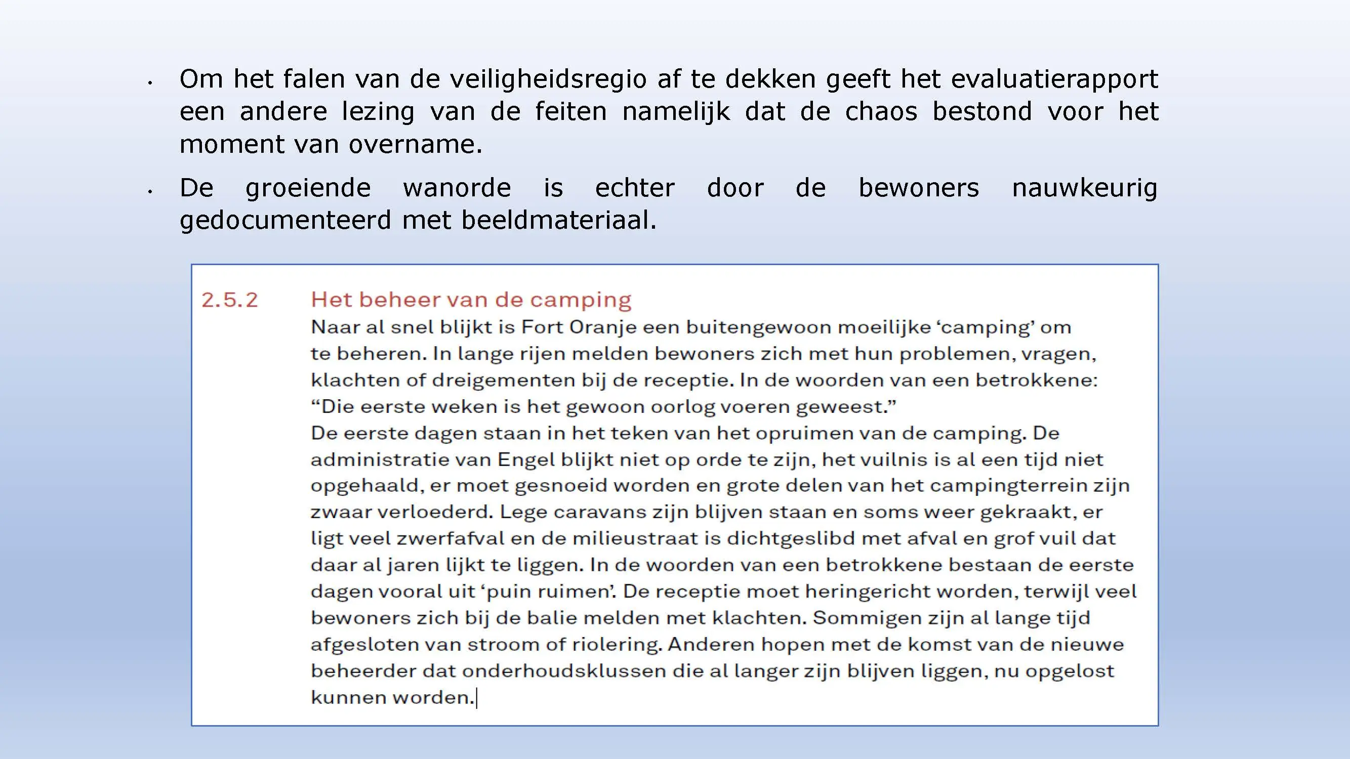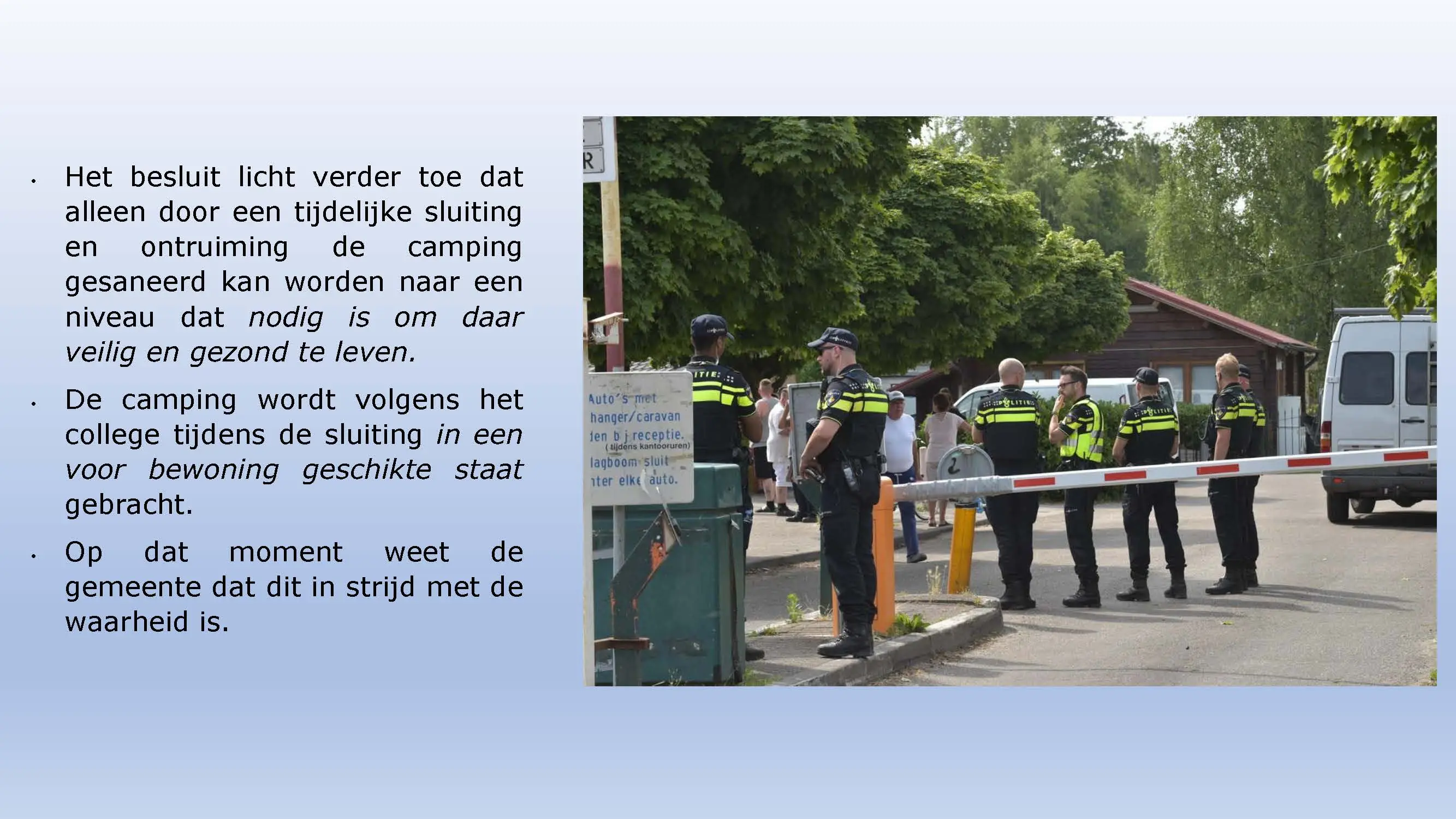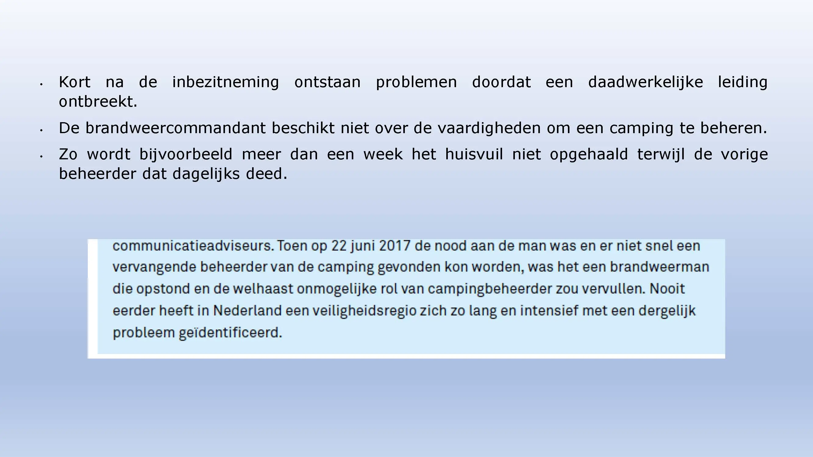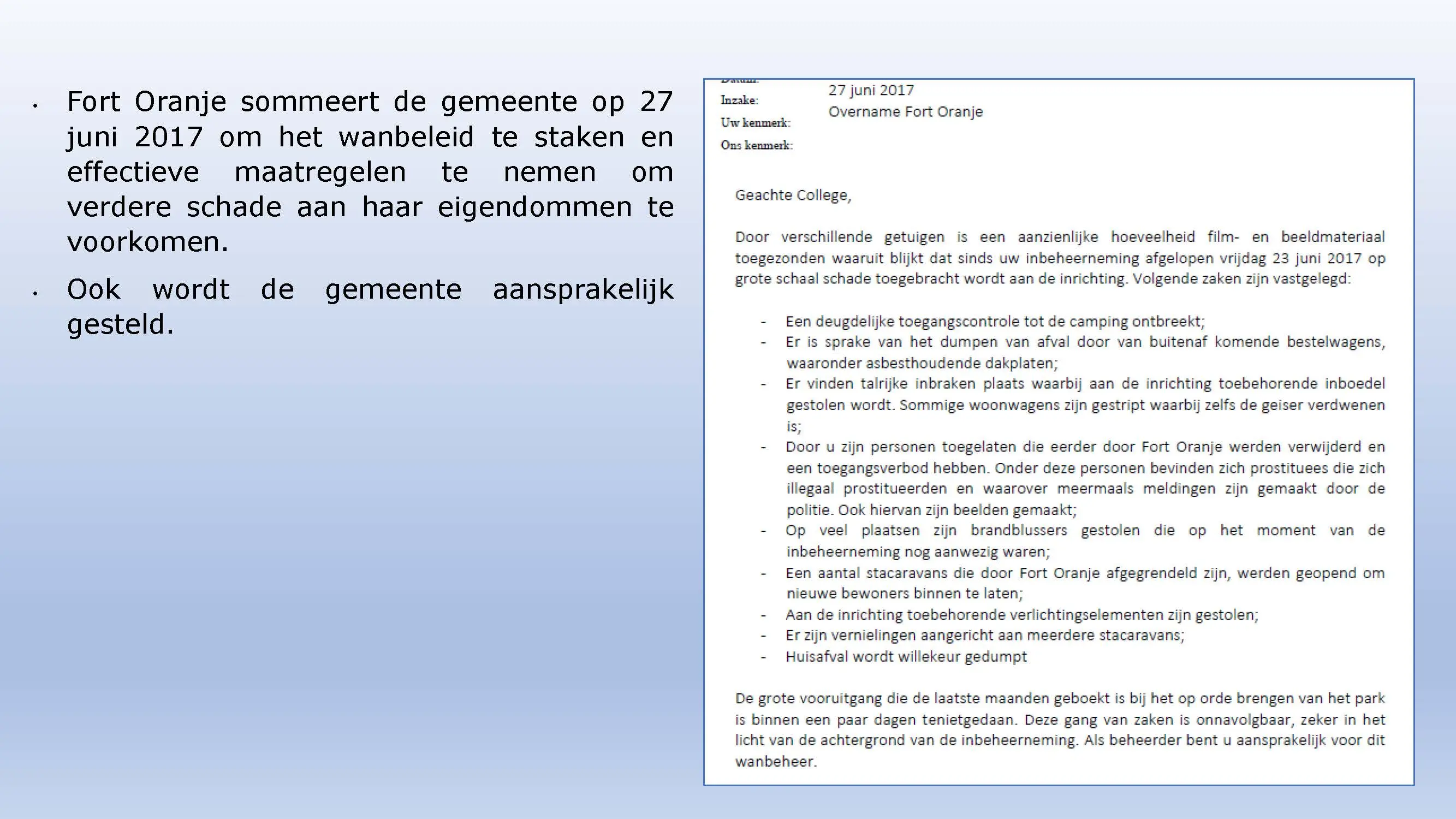 Wat hebben ze daarna gedaan? Vooral bedrog gepleegd, valsheid in geschrifte, rechters voorgelogen. Zelfs de media zich ging afvragen of het optreden van het bestuur nog wel rechtmatig was. Ondanks dat er al vaststond dat er geen bevoegdheden waren, is de camping in beslag genomen, is de eigenaar gearresteerd door middel van een gebiedsverbod, en zijn alle caravans afgevoerd en gesloopt geheel tegen het plan van aanpak in. Volgende week nemen Jeroen en Willem de rekeningen door, namelijk alle beslagen en alle kosten die werden neergelegd bij de eigenaar om het plan te bewerkstelligen dat ie de camping niet meer van de hand kon doen.